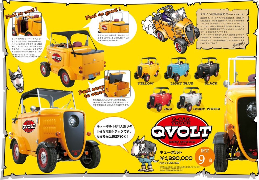 Post Dragon Ball he mostly did short series or one shots, such as the recently adapted Sandland. After Dr. Slump, he created his own studio, Bird Studio, where he did most of his work on Dragon Ball. However, after the series ended the studio saw a large reduction in activity. They did design an Electric car in 2005 named QVolt – an interesting but predictable development given Toriyama’s interest in motorcycles and cars (an obsession present even in his manga, with different bikes and car designs popping up throughout his series). He even went as far as to pay a considerable amount of money to buy and personalize a Jaguar Mark II.