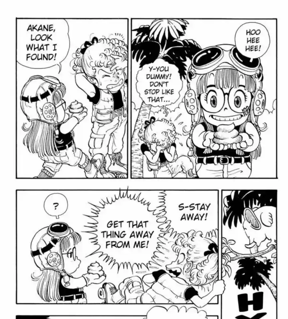 It was actually quite fortunate he didn’t succeed immediately. Regarding those first couple contests he said, “If I had gotten the prize money, I probably would have been satisfied with that and quit.” He did have one manga published in 1978 titled Wonder Island, to vey little attention. He was able to find minor success with his work, Tomato, Girl Detective in 1979. The following year, he started publishing Dr Slump, his first real success. Having never drawn manga himself, he implemented his graphic design skills in his panels. Toriyama’s unique style is highly evident in Dr. Slump, with its novel flare in manga paneling and very Western inspired art style. This was very refreshing at the time given the look and standard of manga up until this point. After searching the web for preceding titles and styles, pretty much every series I saw had a very Tezuka inspired look. Combine that with his impeccable artistic talent and also his seemingly innate talent for creating gag manga, and you have a legacy of permanently altering the medium. Dr. Slump’s popularity should, under no circumstances, be underestimated. It was a colossal success in Japan and was probably as influential as Dragon Ball if not more so (as of this writing I haven’t finished reading the series and Dr. Slump doesn’t have the overall global appeal as Dragon Ball. So, I won’t dwell on Dr Slump too long in the interest of time). One little tidbit I found interesting is that the original look of the poop emoji comes from early gags in Dr Slump. Toriyama seems to be a master at making the most simple designs super iconic, as with his slime design in Dragon Quest. This made me laugh a bit thinking about how a gag in one of my favorite series, Lycoris Recoil, where a parfait Takina makes looks conspicuously like poop, had come from Toriyama’s masterful pen (see image).