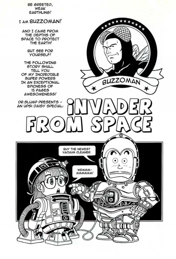 “The first manuscript that Toriyama-kun sent me was a Star Wars parody. Parodies can’t win any prize money. They’re not original and it’s difficult to publish them. Only, his lettering left an unusual impression on me. Sound effects are usually drawn as katakana, but he had drawn them as letters of the alphabet. I thought this was extraordinarily refreshing, groundbreaking, and kind of cool. So I contacted him.” -Shenlong Times Issue #1