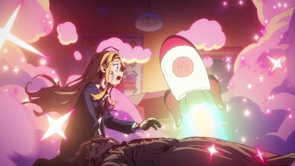 Watching Takopi’s Original Sin was one of the more jarring viewing experiences I have ever had. This lends itself to the extremely saccharine aesthetic that contrasts its emotional coarse subject matter. The characters have simple rounded designs made up of a few circles, big heads and eyes, and small limbs. The titular Takopi has a bright pink hue and appears with the most huggable rounded body that is reminiscent of something that Kanzaki Hiro might have designed. The dichotomy in the art comes from the aggressive linework and jagged sharp edged character models that are implemented to reflect the characters deteriorating mental state of the three main characters, Shizuka, Marina and Azuma. Takopi, an extremely go lucky adorable alien octopus from Happy Planet is on a quest to make everyone he meets super happy! Unfortunately he runs into the most miserable fucken kids imaginable. To top it off he is extremely ignorant of human society and any complex emotions that go beyond happiness and joy. It’s through this lense of Takopi’s misguided efforts that we learn that each kid’s motivations are dredged from their unfortunate home lives. Takopi’s sequences of utter and tragic failures to help quell the children’s despondency ends up hammering home the idea that everyone’s hurdles in life are more multifaceted than we ever realize. It thrusts you into these broken households that makes it palpable that there is no villain of the story or a purely evil individual.